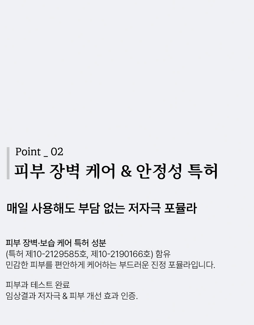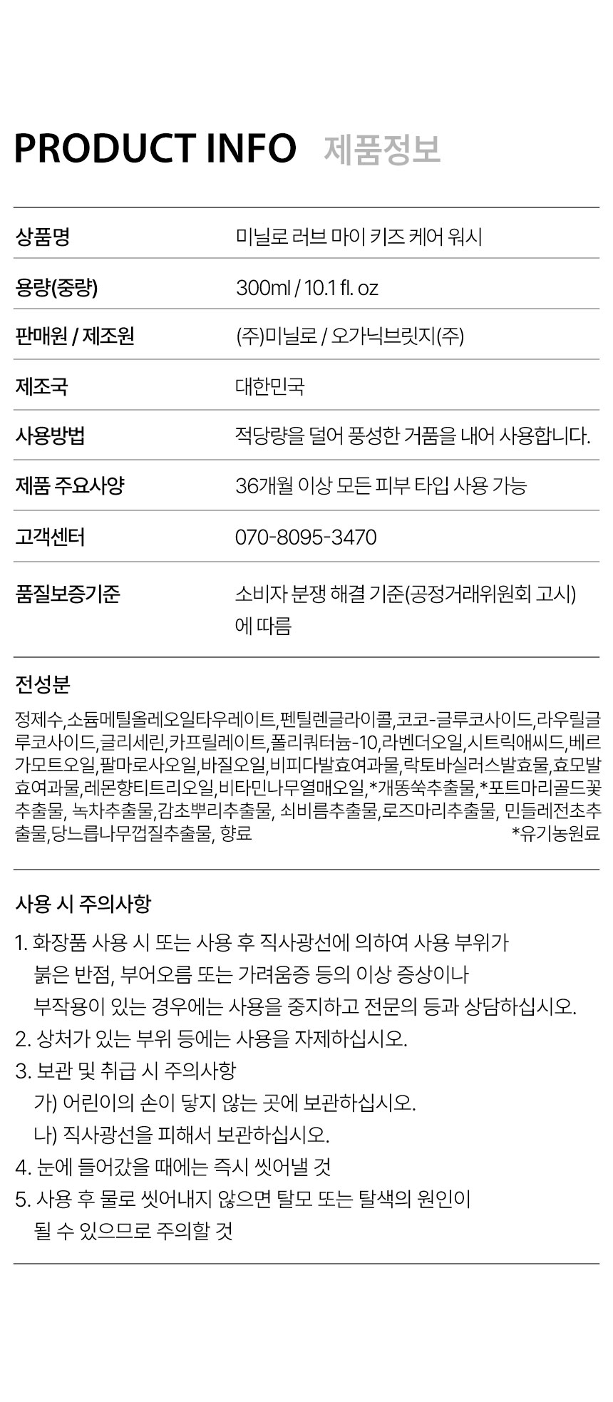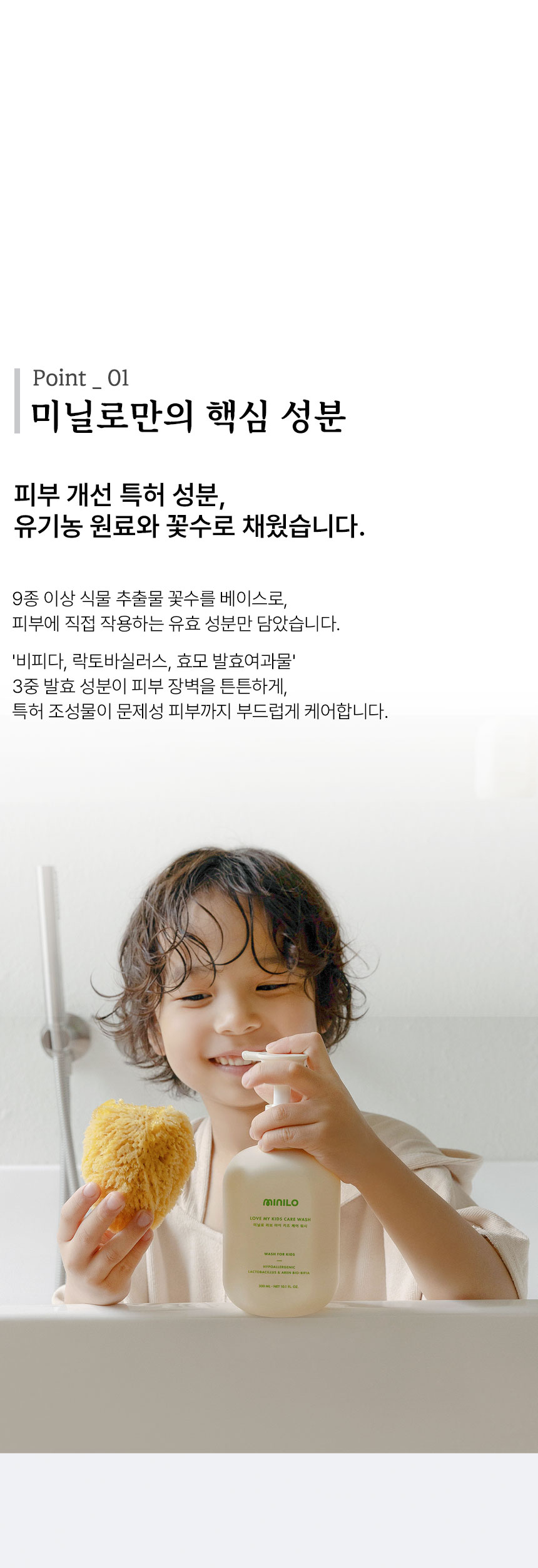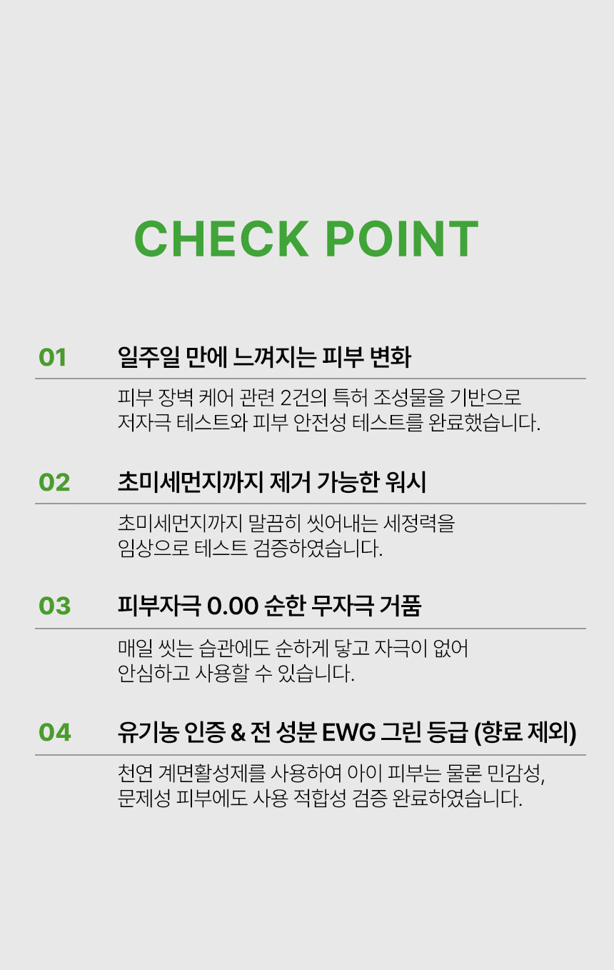 ✔ 유산균 발효 여과물과 식물 유래 성분 함유 ✔ 아토피 피부염 개선제 조성물 특허 등록 원료 함유 ✔ 피부과 테스트 완료 ✔ 천연 계면활성제 사용