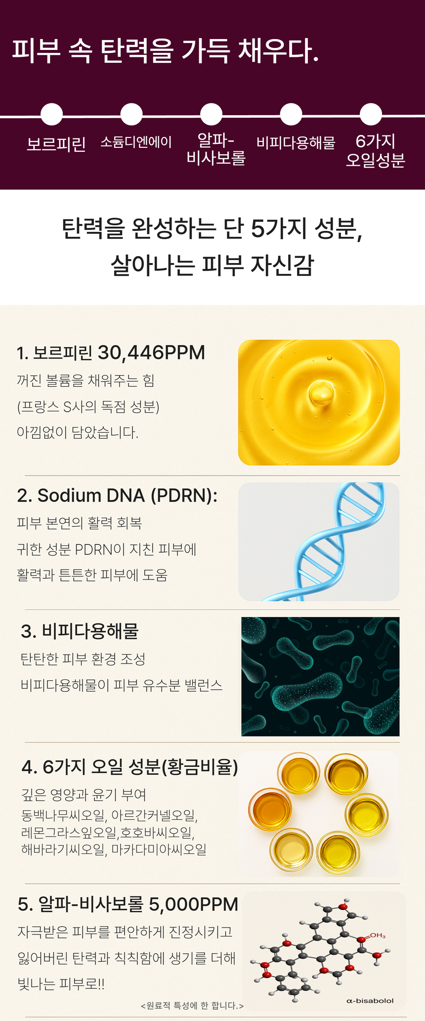정제수, 하이드로제네이티드폴리아이소부텐(30,446.5ppm), 글리세린, 피이지/피피지/폴리부틸렌글라이콜-8/5/3글리세린, 카프릴릭/카프릭트라이글리세라이드, 세틸에틸헥사노에이트, 1,2-헥산다이올, 메틸글루세스-20, 알파-비사보롤(5,000ppm), 락토바실러스발효여과물(1,660ppm), 락토바실러스/쌀발효물(1,660ppm), 효모발효여과물(1,660ppm), 쌀발효여과물(1,660ppm), 비피다발효용해물(1,660ppm), 부틸렌글라이콜, 알지닌, 아크릴레이트/C10-30알킬아크릴레이트크로스폴리머, 폴리아크릴레이트-13, 에틸헥실글리세린, 알란토인, 잔탄검, 아데노신, 다이소듐이디티에이, 향료, 폴리글리세릴-10라우레이트, 에틸헥실팔미테이트, 소듐하이알루로네이트, 동백나무씨오일, 솔비탄아이소스테아레이트, 지모뿌리추출물(12ppm), 소듐디엔에이, 레몬그라스잎오일, 호호바씨오일, 아르간커넬오일, 마카다미아씨오일, 해바라기씨오일, 토코페롤