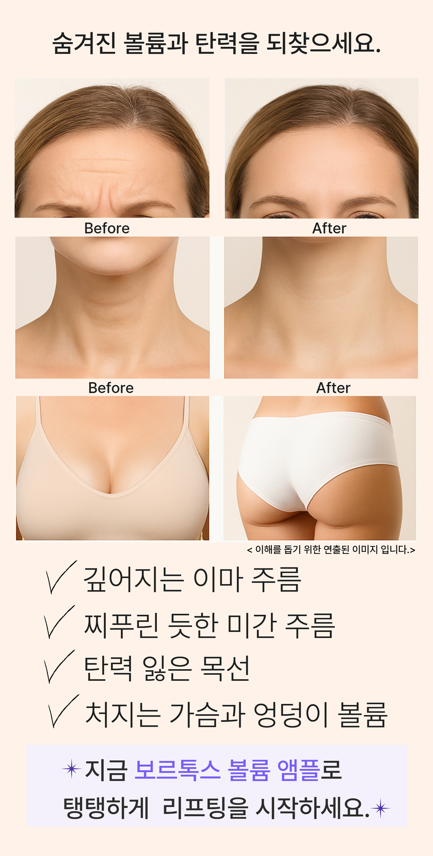 목주름, 미간주름 등 처진 부위의 리프팅/ 끈적임이 적어 산뜻하게 흡수되는 주름개선 기능성 / 피부저자극테스트 완료