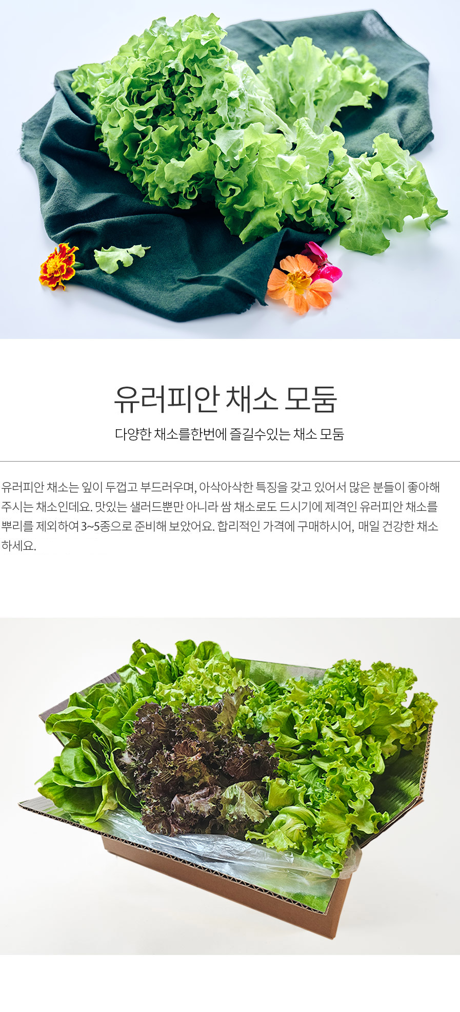 버터헤드, 미니로메인, 멀티리프(녹색/적색), 바타비아(녹색/적색), 크리스탈(녹색/적색) 중 4~6종의 샐러드 채소로 포장됩니다.