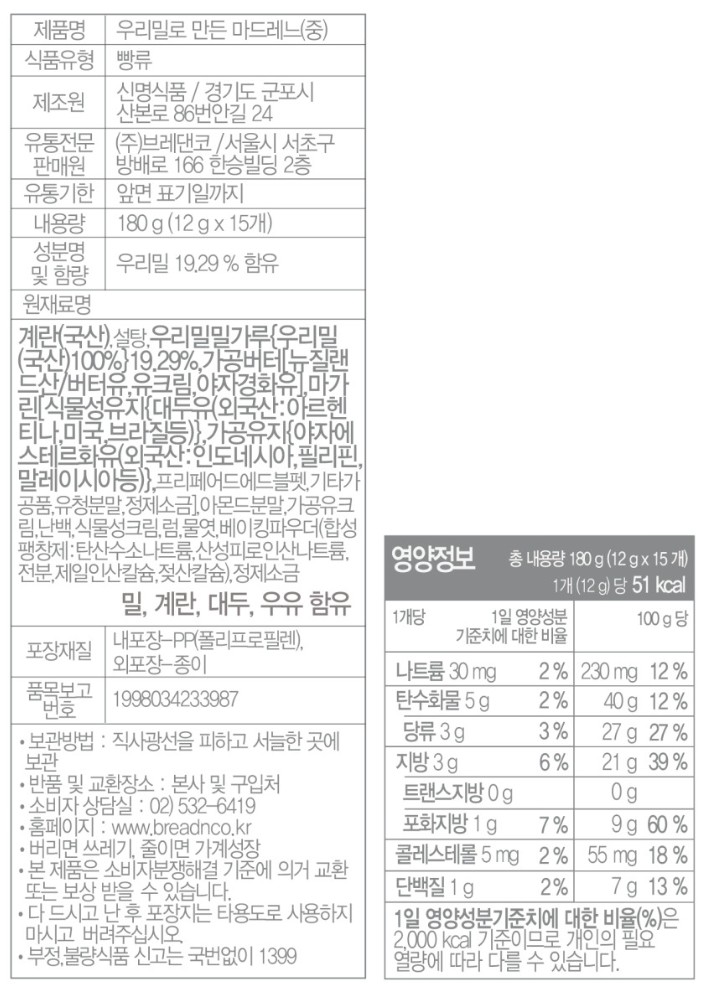 우리밀 마드레느(중, 12g*15개)