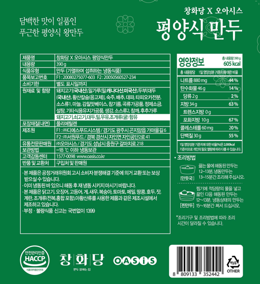 돼지고기(국내산),밀가루(밀:캐나다산,미국산),두부[대두(국내산),황산칼슘(응고제)],숙주,배추,대파,타피오카전분,소스류1,마늘,감칠맛베이스,참기름,곡류가공품,정제소금,설탕,기타식용유지가공품,생강,소스류2,참깨,후추가루 돼지고기,쇠고기,대두,밀,우유,조개류(굴) 함유