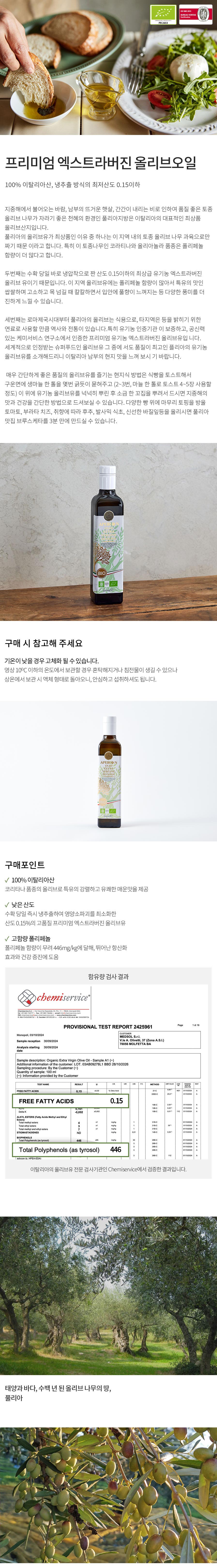 프리미엄 유기농 냉추출 올리브유, 0.15이하의 저산도,